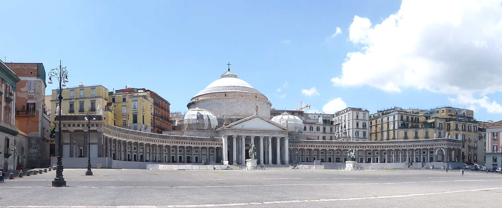 La Piazza del Plebiscito è una piazza spettacolare, divisa in due parti distinte. La prima parte, ai piedi della Basilica di San Francesco di Paola, è un semicerchio perfetto, delimitato da un colonnato. La seconda parte, al di sotto dell’asse di chiusura dell’emiciclo, ha una forma rettangolare, determinata da due palazzi gemelli e dal profilo del Palazzo Reale.